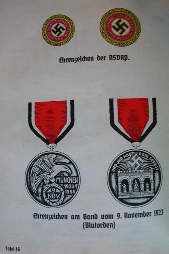 The top is the Golden Party Badge, given to early party members. The lower medal is the “Blood Order,” the medal given to those who had marched with Hitler in his abortive 1923 Putsch.
