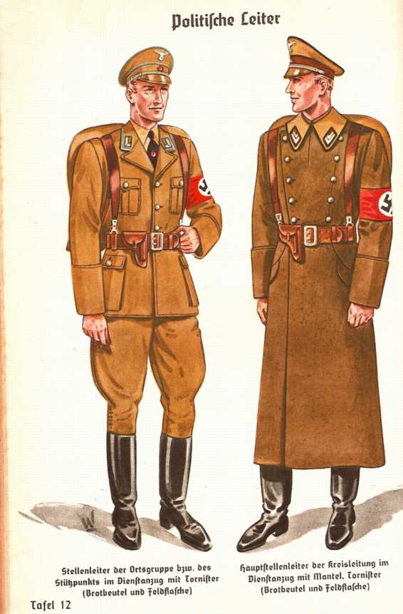 The uniform to the left is that of an Ortsgruppenleiter, or local group leader, of the party. Note the Ehrenwaffe, or pistol. He also has a rucksack for outdoor activities.