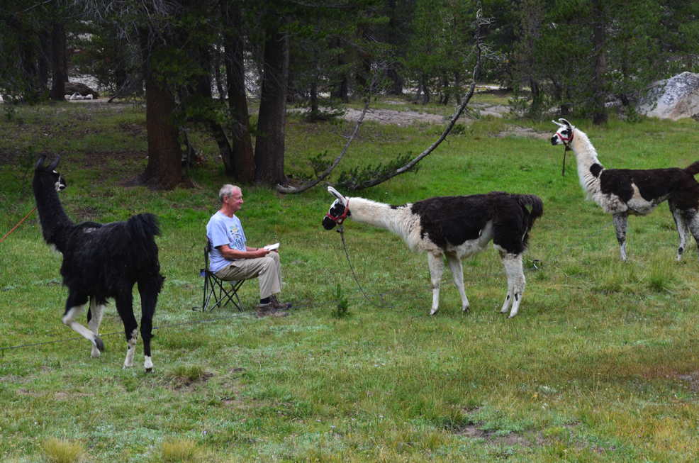 At Green Creek Trail HeadSaturday, July 26: The flight out. After a smooth trip from Grand Rapids we drove to our VRBO rental house in Sonora, which turned out to be much better than a hotel. We had lots of room for the seven of us, ranging in age from the fifties to the seventies. Sunday, July 27: Llama Training We’ve used mules in recent years to haul in our gear to a base camp. This year we wanted to cover more ground, so we resolved to try llamas. Potato Ranch Llama Packers in Sonora rents llamas to experienced hikers. We gave it a try. At 9:00 a.m. we headed out to be trained. Greg Harford does a fine job. In three hours he gave us a thorough introduction to the care and handling of his gentle, capable beasts. There’s nothing difficult about it, but there are a lot of details. Dan quickly bonded with the llamas and became our lead llama wrangler during the following week.